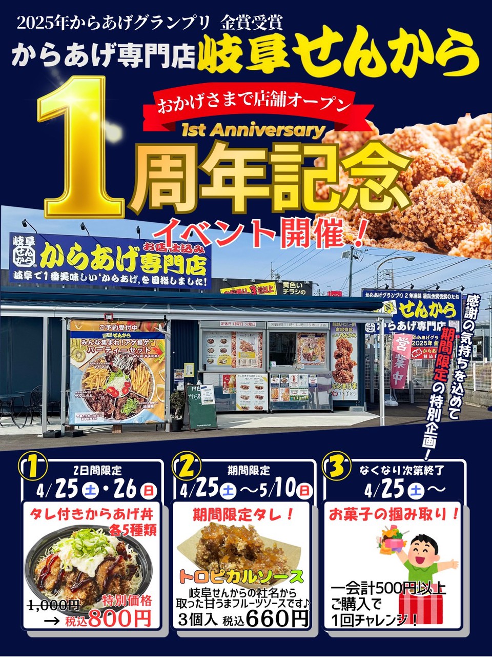 いつもご利用ありがとうございます!おかげさまで「岐阜せんから」は2026年4月25日(土)をもちまして店舗オープン1周年を迎えます!
