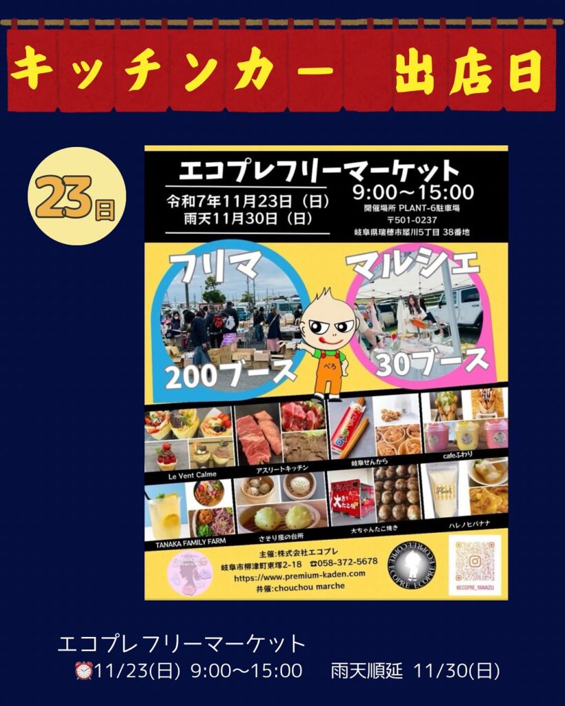 明日日曜日はエコプレさんのフリーマーケットにキッチンカー出店させていただきます🚛✨
