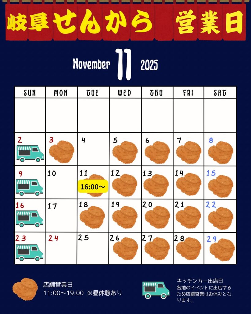 その他店舗営業日の営業時間は11:00〜19:00となっています。