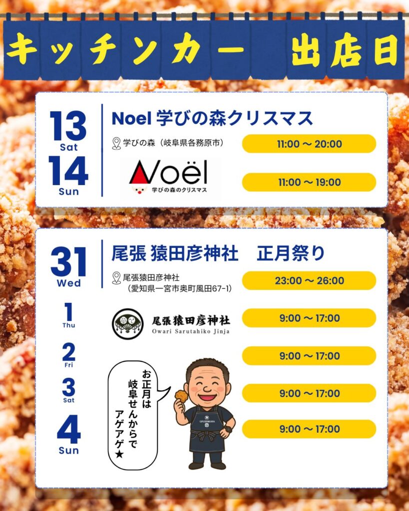 12月は日曜日やキッチンカー出店日も店舗営業🍗✨